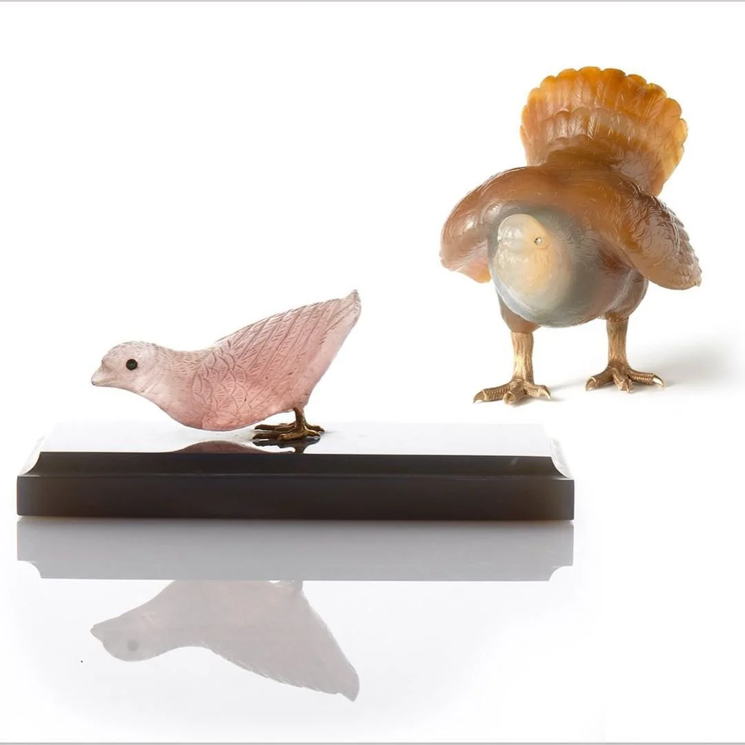 A weekend game. Both made over a century ago, one of these owls is Cartier, the other Fabergé — two master jewellers who were battling it out for the business of the Belle Époque set. Can you tell which is which?