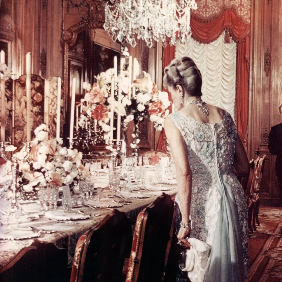 Another fabulous jewel spotted in Washington this month. This one was made for one of Cartier's best American clients, Marjorie Merriweather Post, in the 1930s when the fashion was for wearing low-backed evening gowns with a fabulous back drop necklace. In this case the 4-stranded natural pearl necklace made by Cartier New York in 1936 had the most jaw-dropping diamond back. Love it. You can see how it was worn by Post at one of her famous Hillwood dinner parties in the second image.